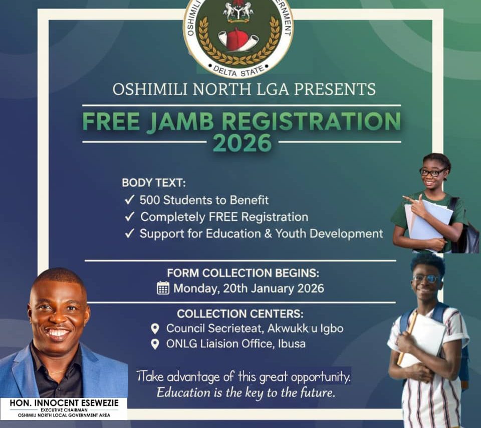 The Executive Chairman of Oshimili North Local Government Area, Delta State, Hon. Innocent Esewezie, has formally announced the commencement of the 2026 Free UTME Registration and Tutorial Programme for prospective candidates seeking admission into higher institutions.